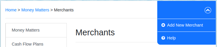 Most pages also present a dropdown menu providing options for interacting with the current page (for example, if you're looking at a merchant, the page menu will provide an option for editing that merchant).